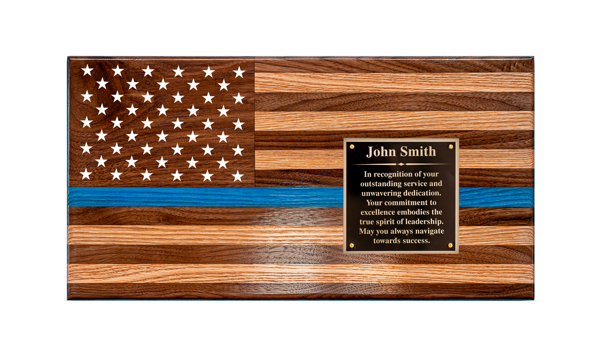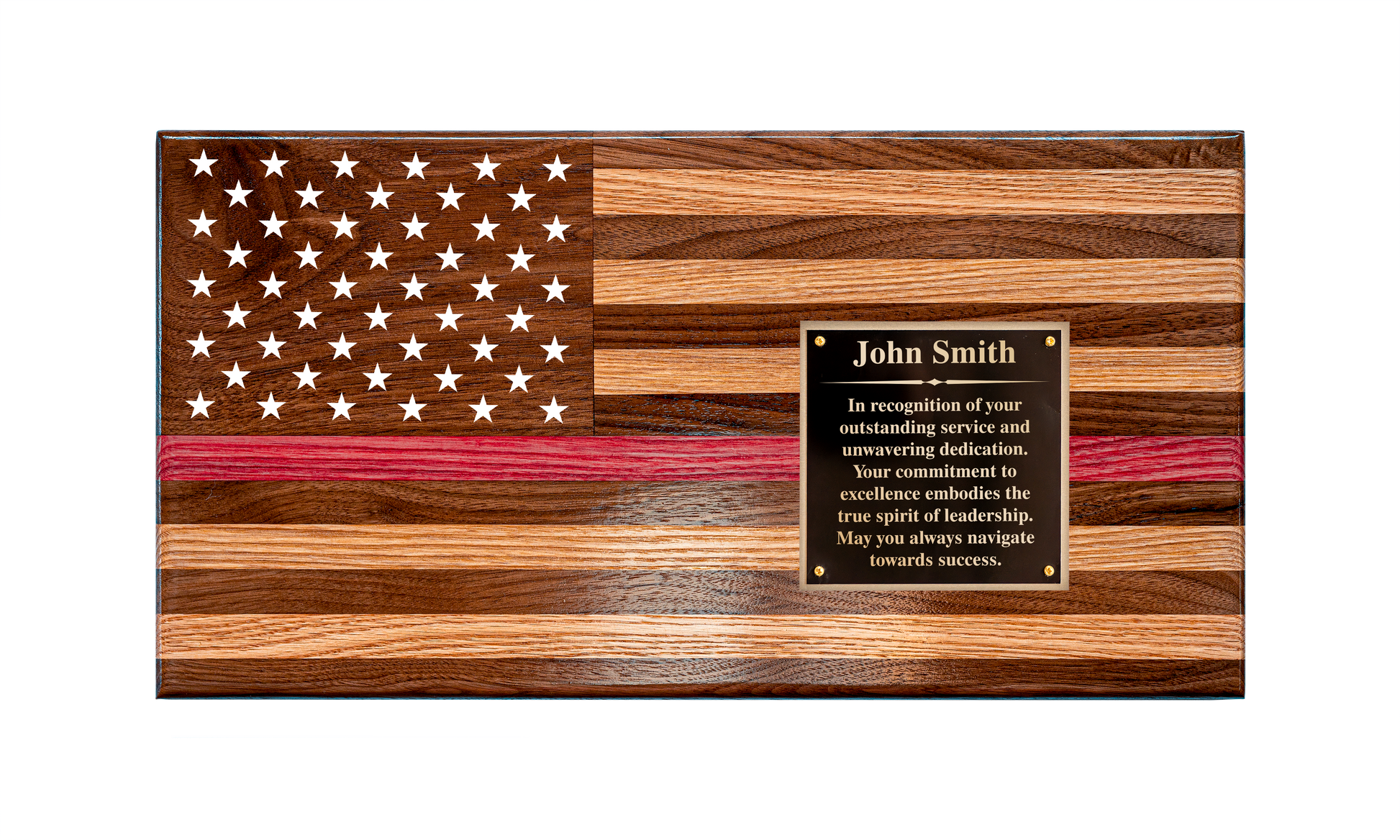 This customizable wooden flag makes the perfect holiday gift or a statement piece for any home, office, or event. Personalize it to honor heroes with a red stripe for firefighters or a blue stripe for police and rescue personnel. Add a custom text plate to commemorate special occasions, achievements, or loved ones.